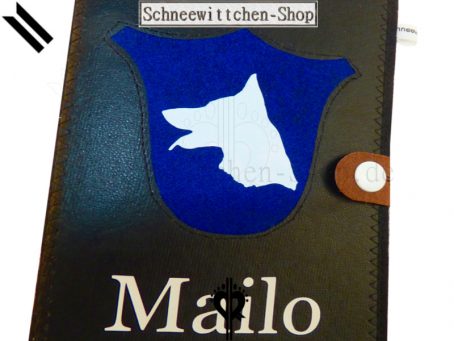 Für den EU Heimtierausweis / Pet Passport. Satin in blau mit Hunde-Applikation eingefasst in Kunstleder. Fühlt sich toll an.