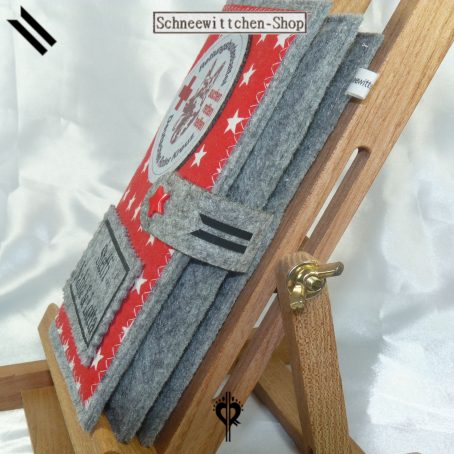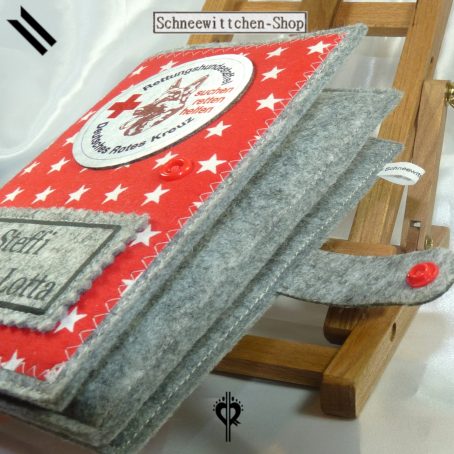 Diese Hülle dient zur Aufbewahrung des Dienstbuches und der Impfpässe der DRK Rettungshundestaffel. Hier mit einem tollen Logo dargestellt. Auf der Rückseite wird das Logo noch einmal als Button in veganes Leder gelasert.