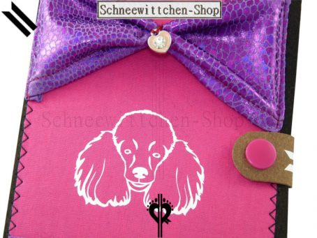 Die EU-Heimtierpass Hülle Pink Snake mit silbernem Herzanhänger zeigt hier einen Pudel. Der Namen und die Grafik des Hundes werden nach deinen Wünschen gefertigt.