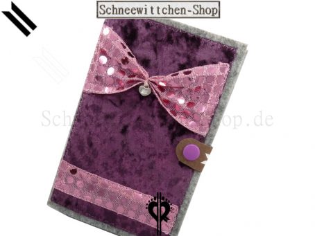 Die EU-Heimtierpass Hülle Purple Glitter Bow mit silbernem Herzanhänger.