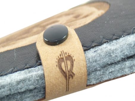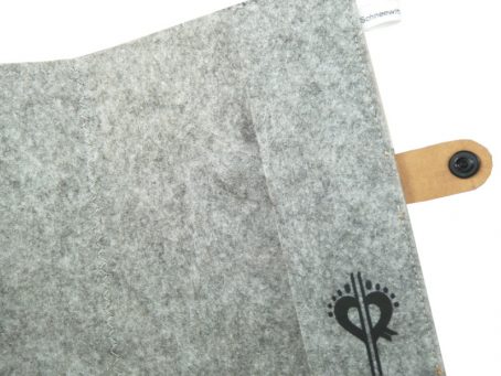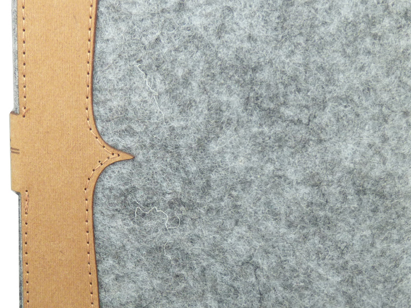 Die Hülle ist aus 100 Polyester Filz mit braunem Kunstleder gearbeitet und fühlt sich sehr hochwertig an. Auch der Verschluss aus veganem Leder mit dem rückseitigen Schild werten das Produkt optisch auf.